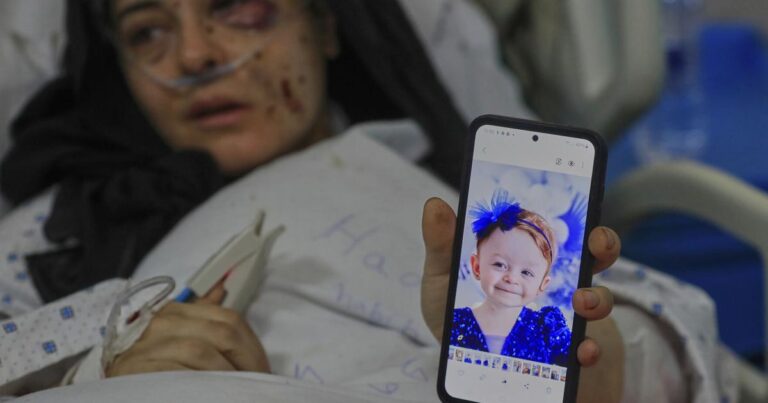 The children’s mother, Amina Bazzi, and her oldest daughter, Asil, survived but were seriously wounded. Bazzi, her face bruised and swollen, was carried on a stretcher through the crowd at the funeral of her husband and children.