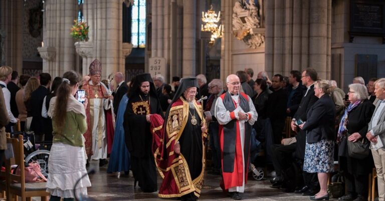 THE centenary of the inter-denominational Universal Christian Conference on Life and Work, convened by Archbishop Nathan Söderblom in Stockholm, an early landmark in the ecumenical movement, was commemorated in the primatial cathedral in Uppsala, Sweden, last weekend. Church leaders present at the service, on the theme “Time for God’s Peace”, included the Archbishop of York and Patriarch Bartholomew of Constantinople, who led the recitation of the Nicene Creed in Greek. The present Archbishop of Uppsala, Dr Martin Modéus, presided.